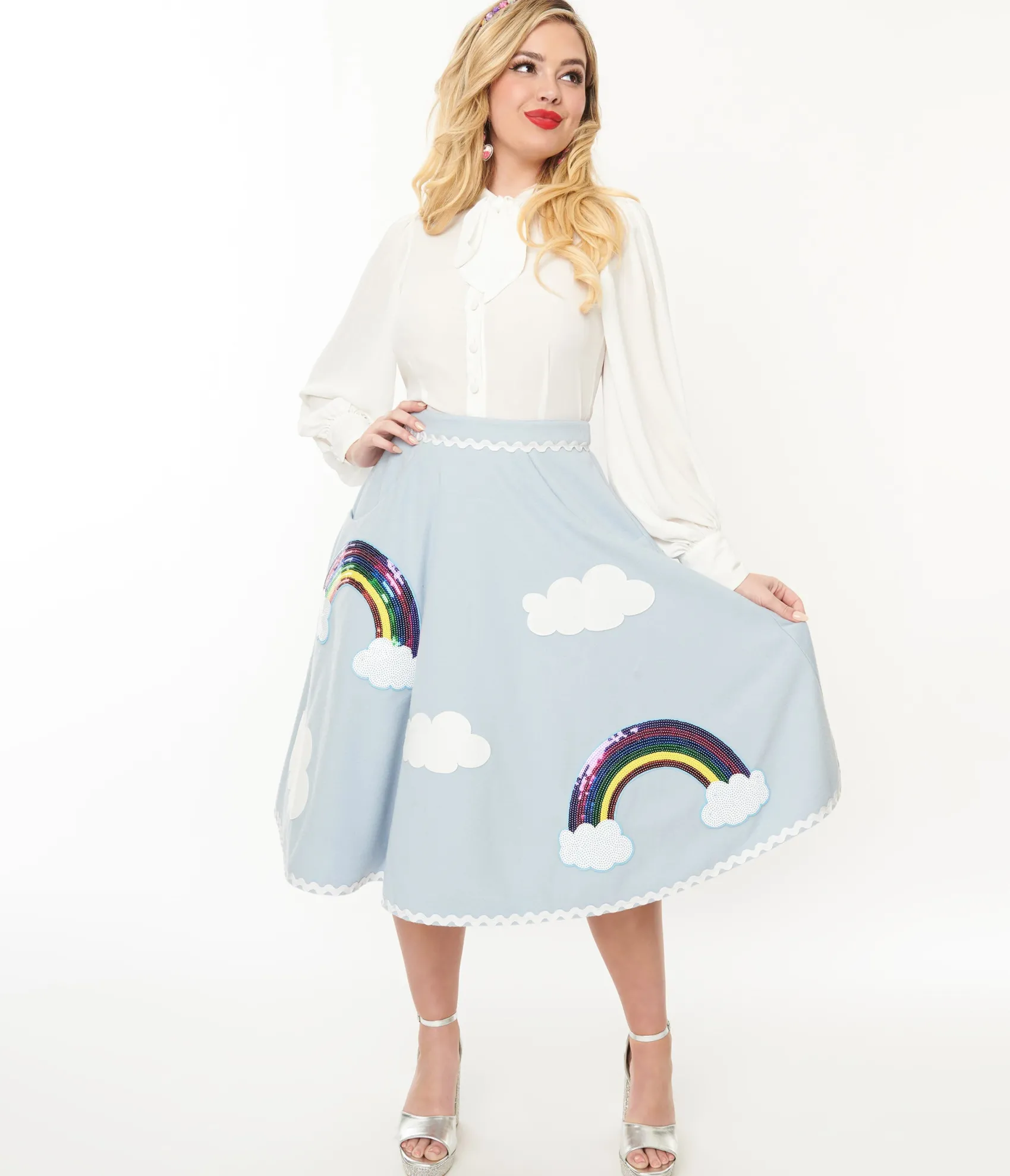 Unique Vintage 1950s Light Blue & Rainbow Sequin Soda Shop Swing Skirt
