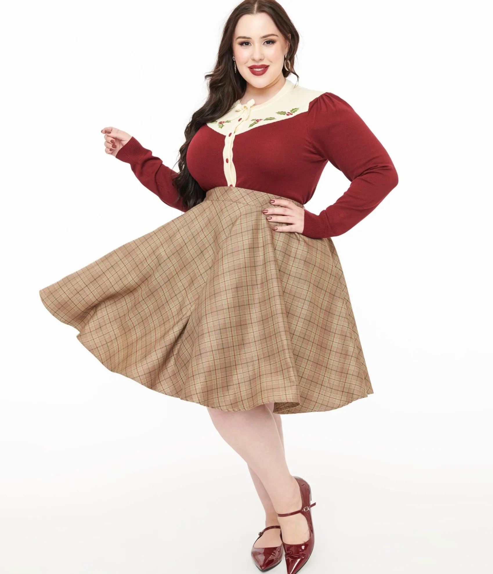 Smak Parlour Plus Size 1960s Brown & Green Plaid Scene Flare Skirt