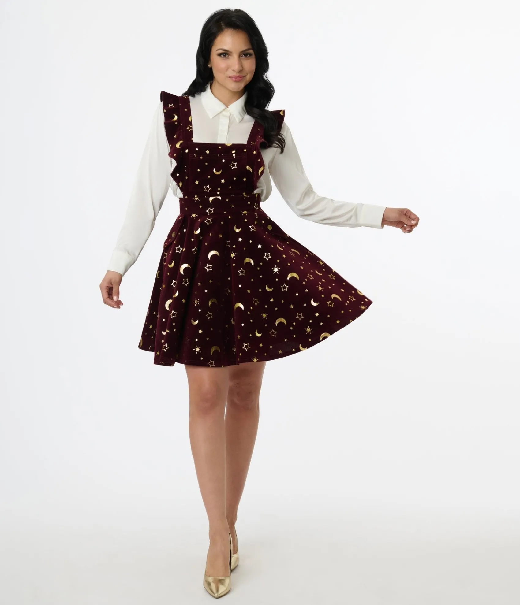 Unique Vintage Burgundy & Gold Moon & Star Corduroy Ruffle Pinafore